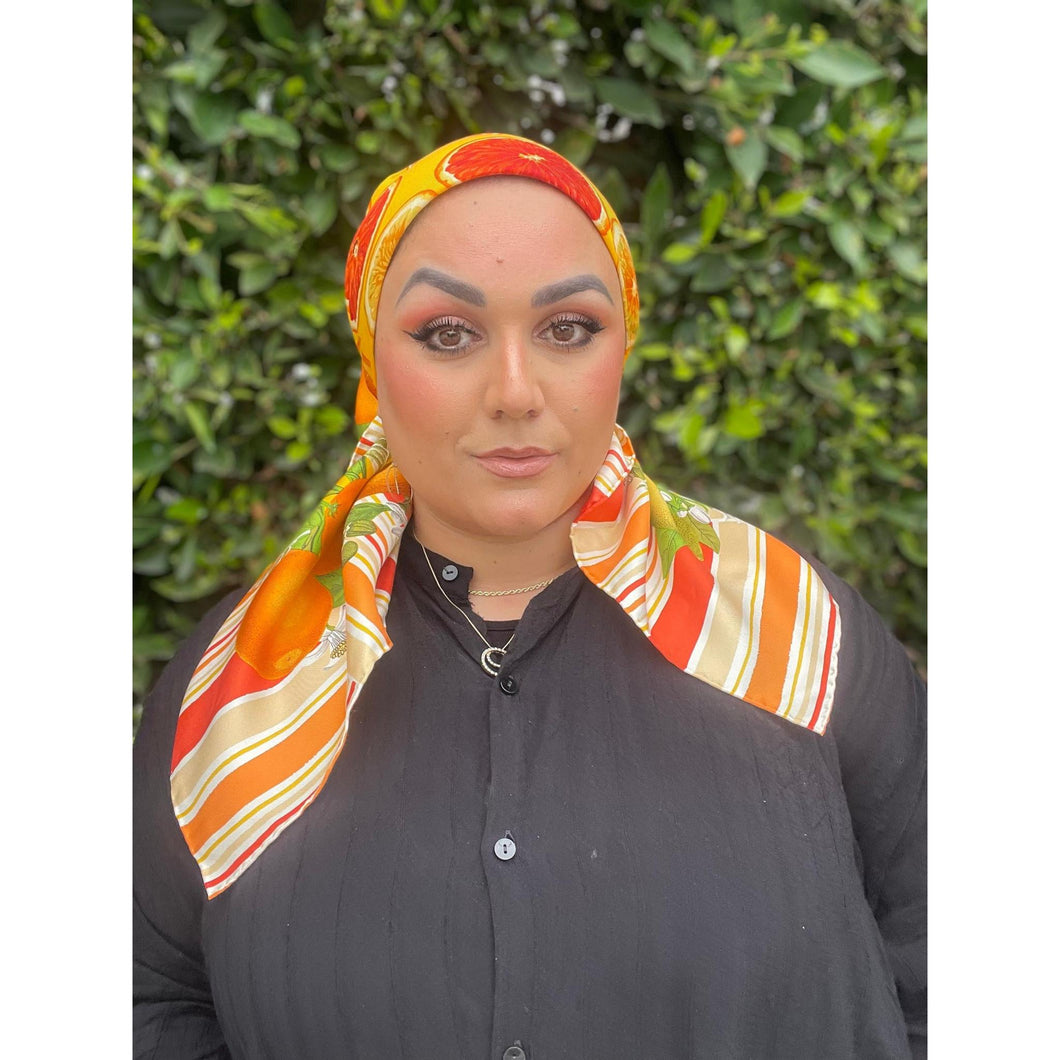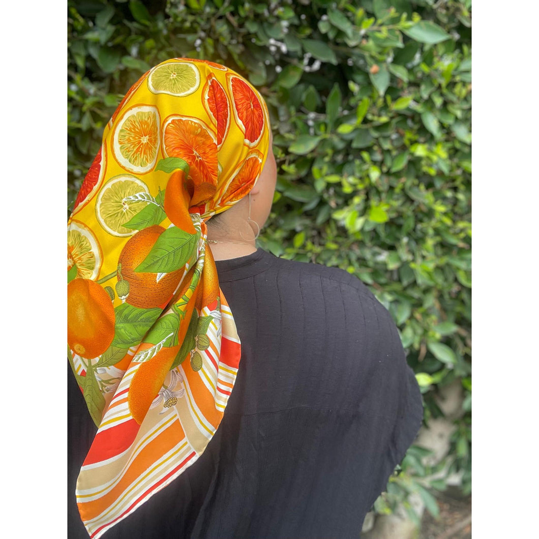 - The scarf features a colorful array of citrus fruit slices and whole fruits with leaves and blossoms arranged around a yellow center and striped border.