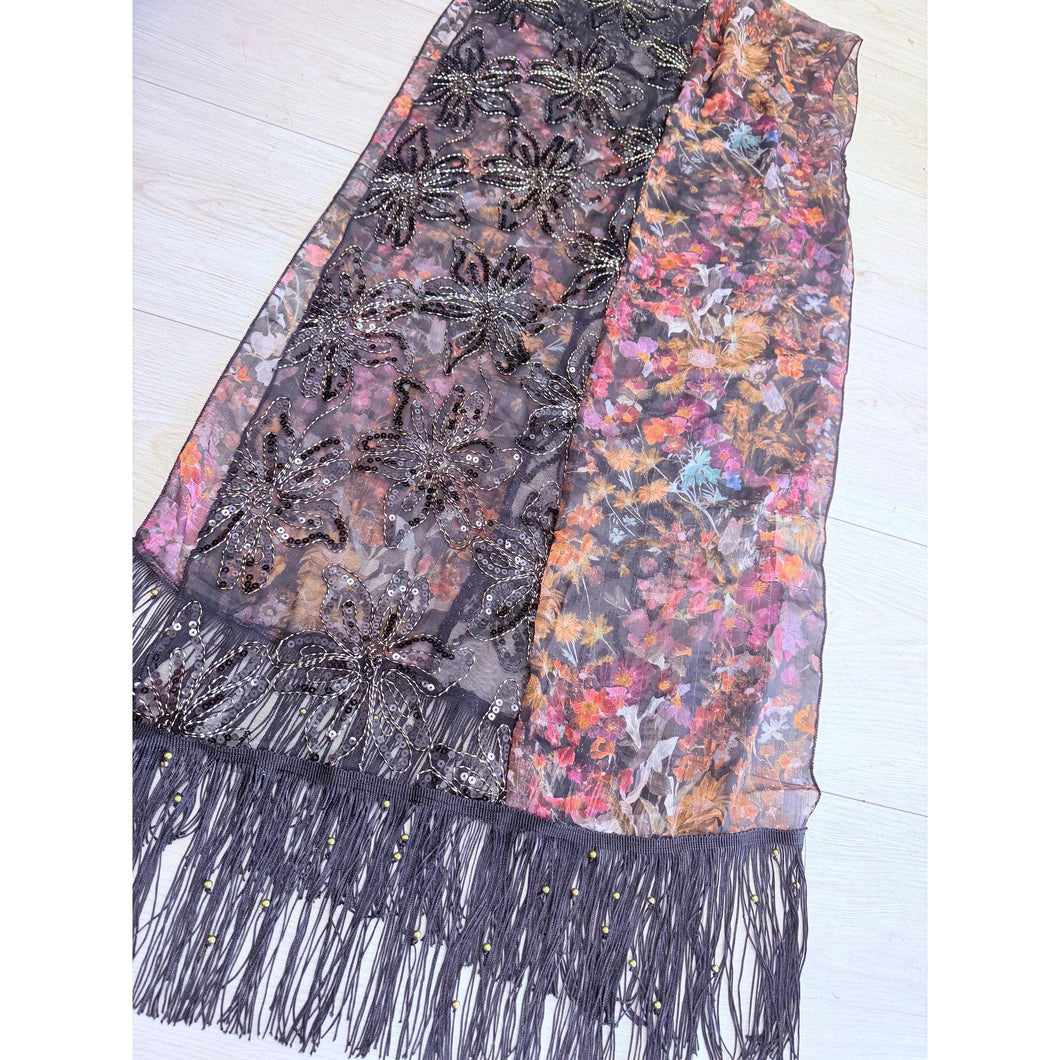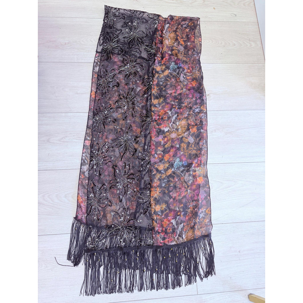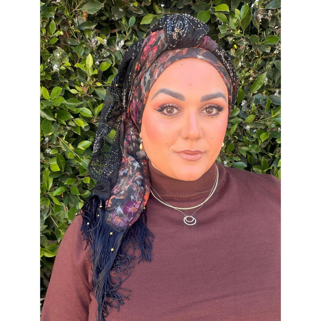 Our Holuda Exquisite Headwrap is a beautiful, lightweight wrap designed for women who love the look of multiple elements in one piece. It features two complementary panels that come together effortlessly when styled. One half showcases a soft, chiffon-like floral fabric with delicate, lurex threads woven throughout, adding movement and subtle texture. The other half is crafted from a sheer black mesh adorned with intricate floral embroidery and delicate sequin detailing that catches the light just enough.