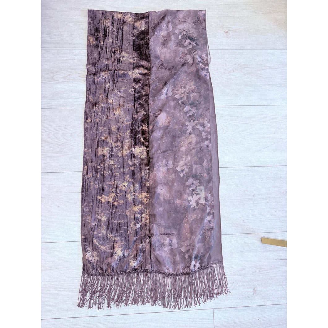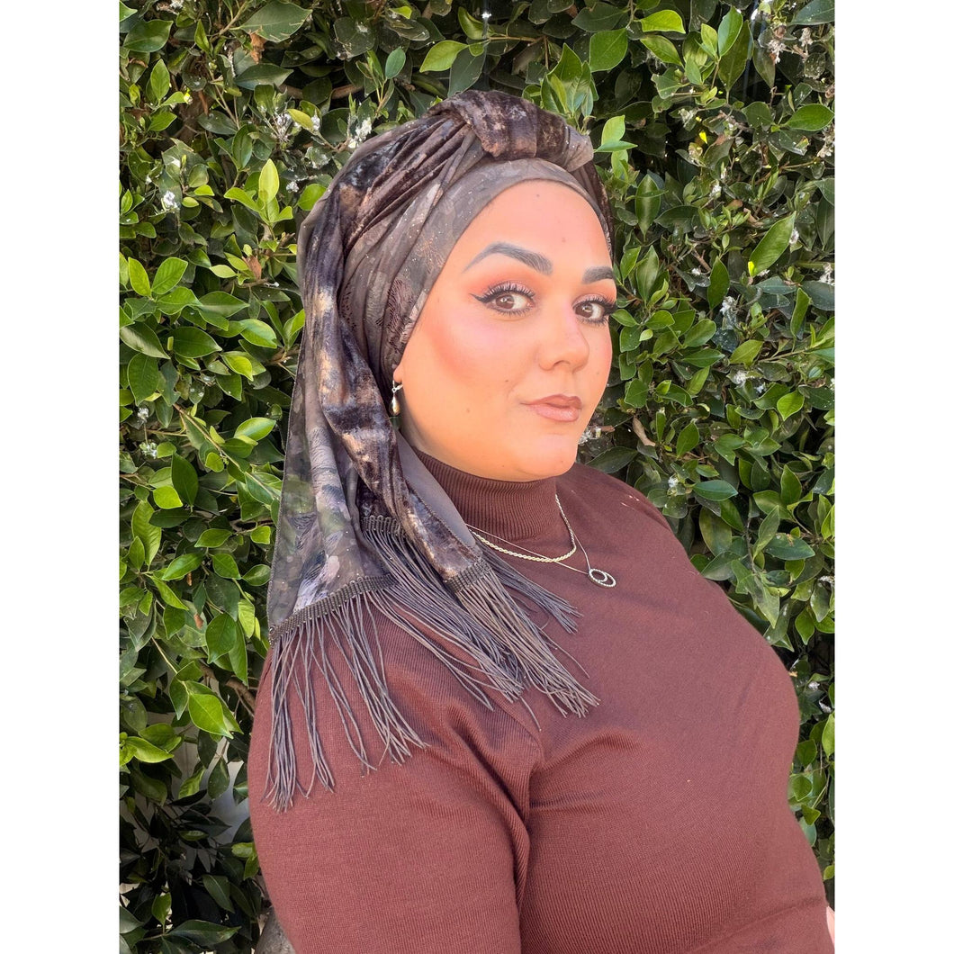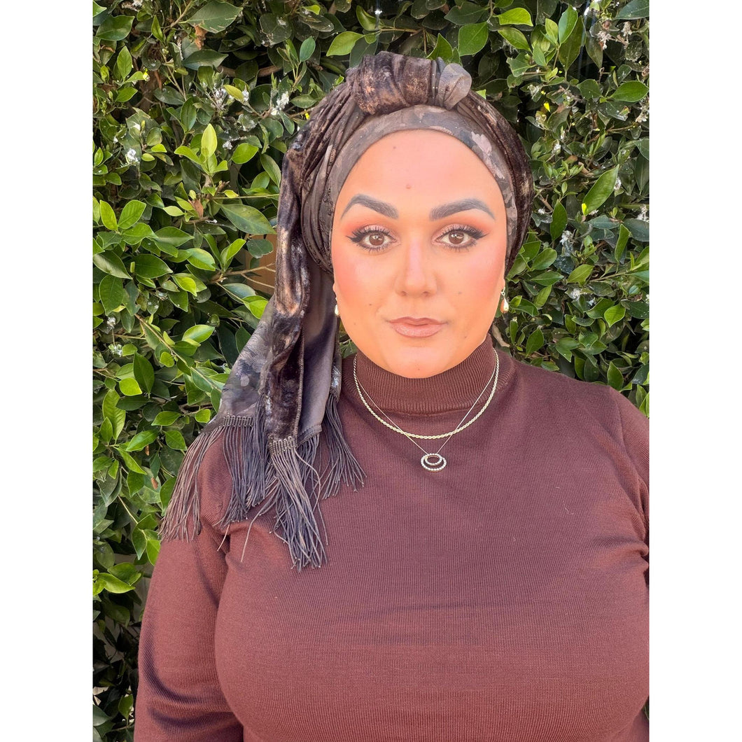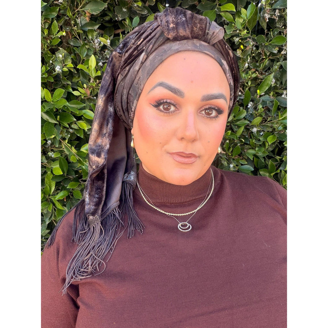 This Hodula Exquisite Headwrap is a beautiful rich piece designed for lovers of brown tones. This long wrap features two complementary fabrics that come together effortlessly when styled. One half is crafted from a brown crushed velvet accented with delicate embedded gold metallic details that add depth and subtle shine. The other half showcases a soft chiffon floral print, finished with scattered gold splatter accents for a refined, luminous touch.