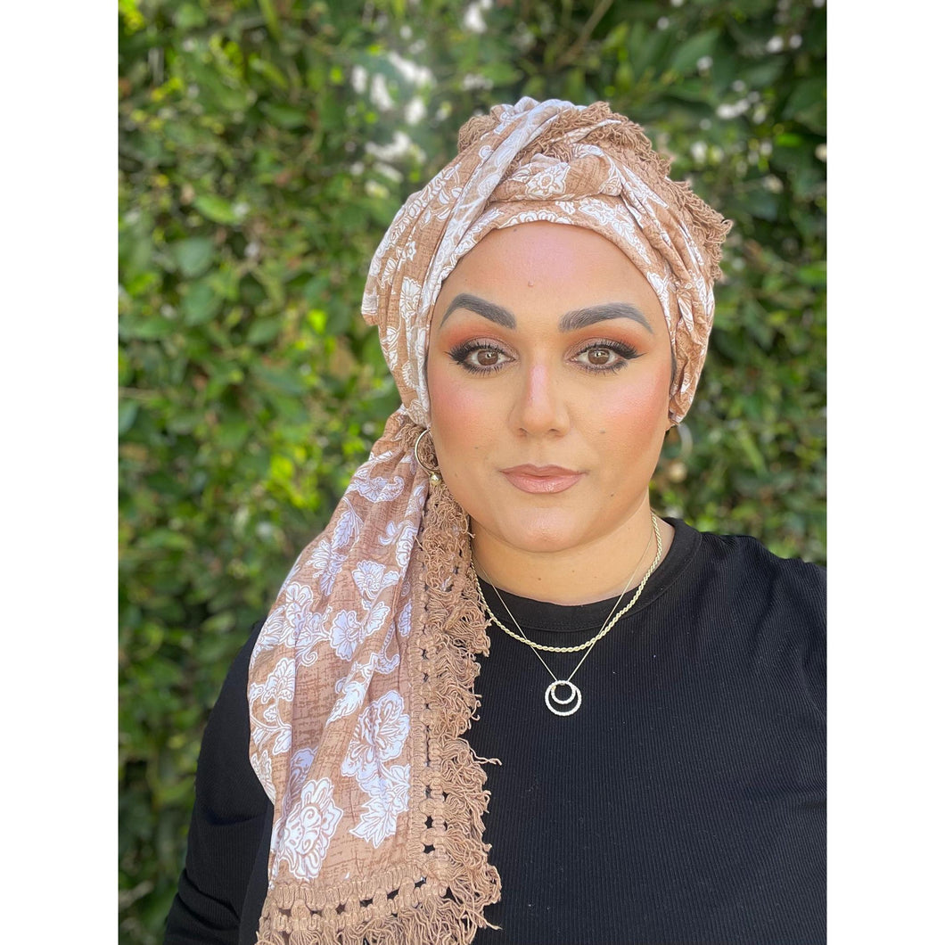 First up, the fabric itself is made from a lightweight cotton, but because it's extremely big it ends up weighing more than your average square scarf. The tassel details go along two sides of the scarf that are next to eachother so you can get the tassel details to show on both sides or only on one side of your head when you wrap it. You can easily achieve a voluminous look with this square because of how big it is.