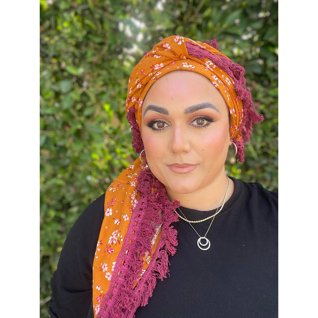 First up, the fabric itself is made from a lightweight cotton, but because it's extremely big it ends up weighing more than your average square scarf. The tassel details go along two sides of the scarf that are next to eachother so you can get the tassel details to show on both sides or only on one side of your head when you wrap it. You can easily achieve a voluminous look with this square because of how big it is.