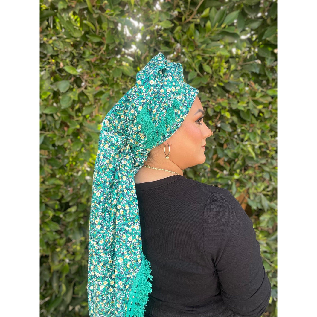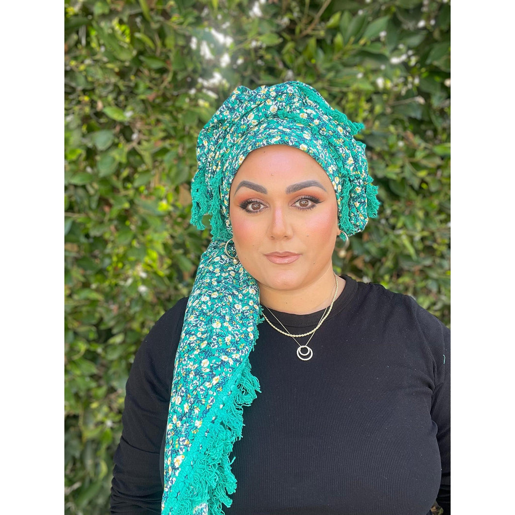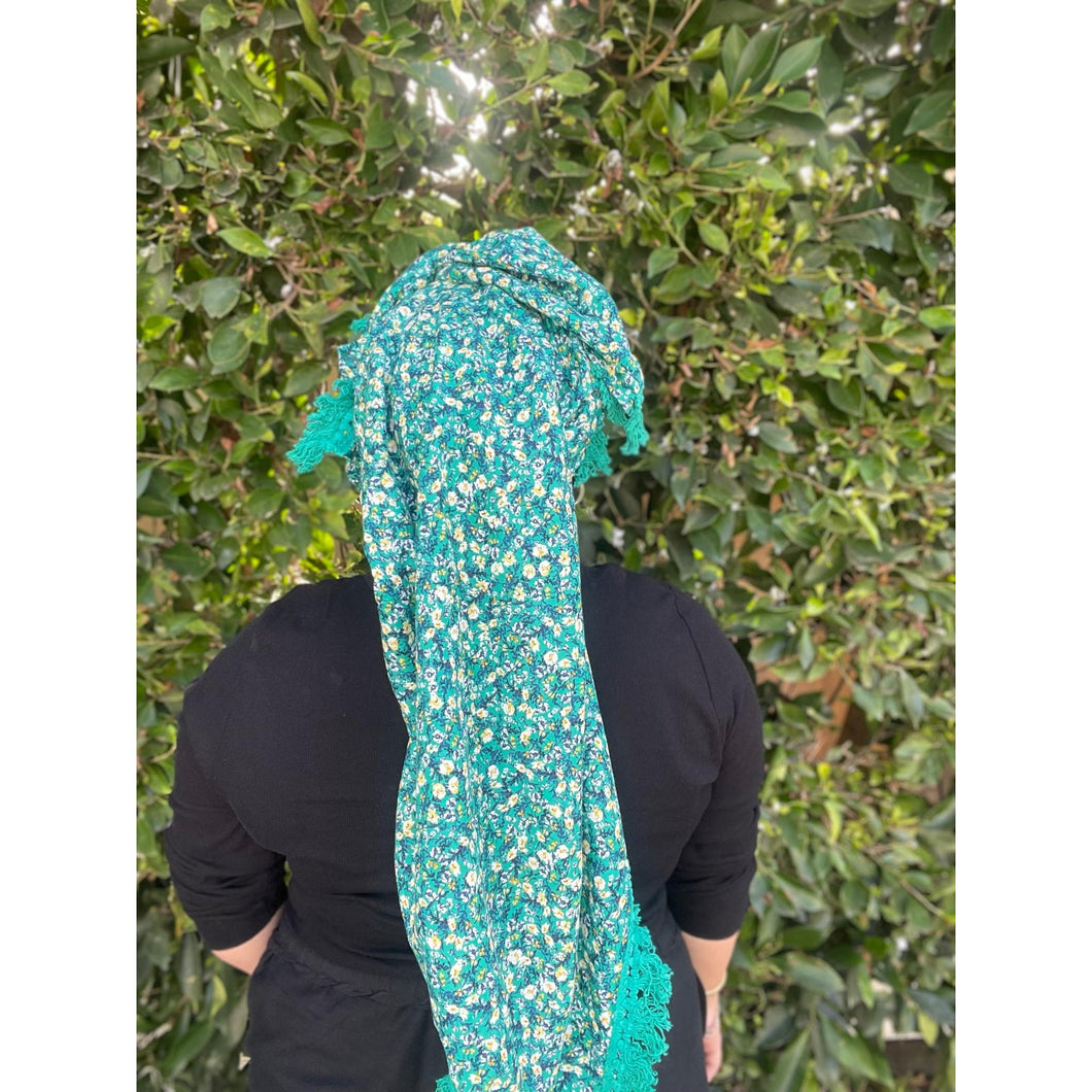 First up, the fabric itself is made from a lightweight cotton, but because it's extremely big it ends up weighing more than your average square scarf. The tassel details go along two sides of the scarf that are next to eachother so you can get the tassel details to show on both sides or only on one side of your head when you wrap it. You can easily achieve a voluminous look with this square because of how big it is.