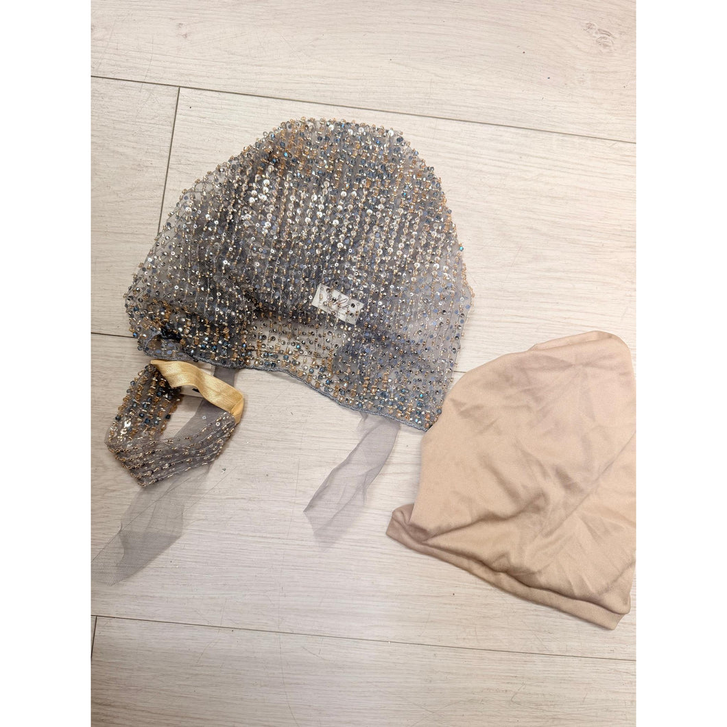 The fabric has slightly more weight to it because of it's quality, it can be worn over a variety of volume sizes. This piece comes with a lightweight/stretchy base to wear underneath so that the headcover is opaque. This style works for all head circumferences. This style also comes with a matching scrunchie that can be worn when wearing a low-bun style.