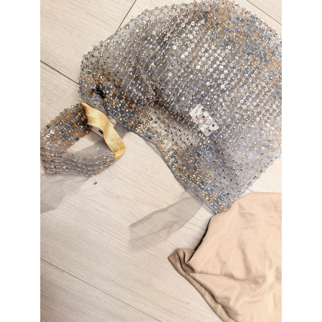 The beaded plus sequins details and exquisite craftsmanship of the fabric add to the finished look, nobody would ever guess that you did little to nothing to wear this piece. The matching scrunchie adds to the finished look.