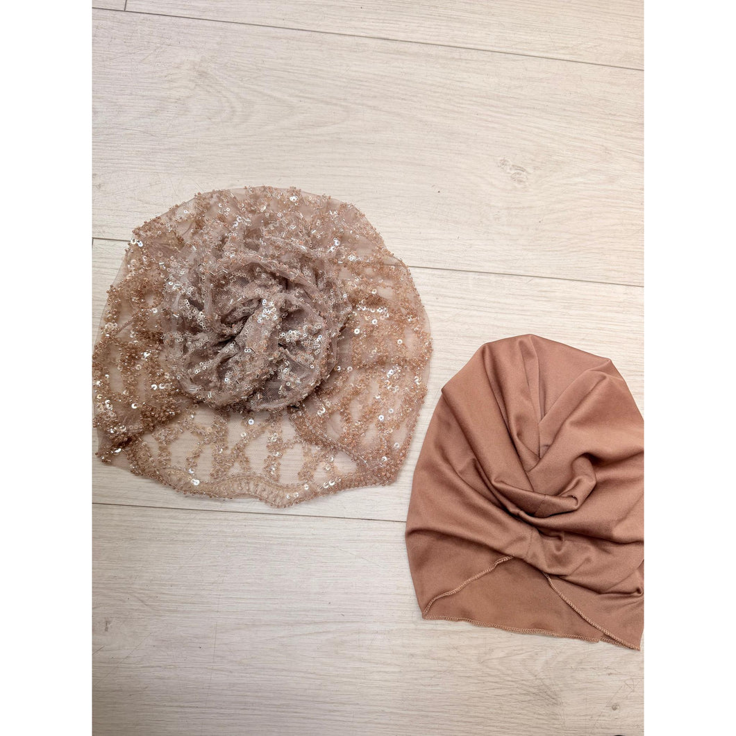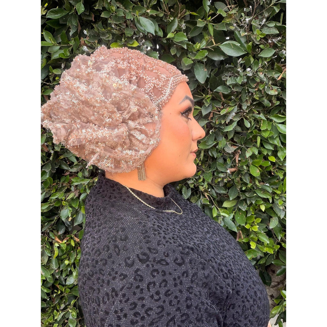 The fabric has slightly more weight to it because of it's quality, it can be worn over a variety of volume sizes. This piece comes with a lightweight/stretchy base to wear underneath so that the headcover is opaque. This style works for all head circumferences. This style also comes with a matching scrunchie that can be worn when wearing a low-bun style.