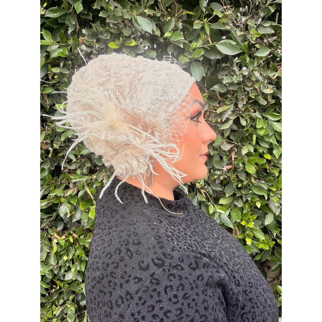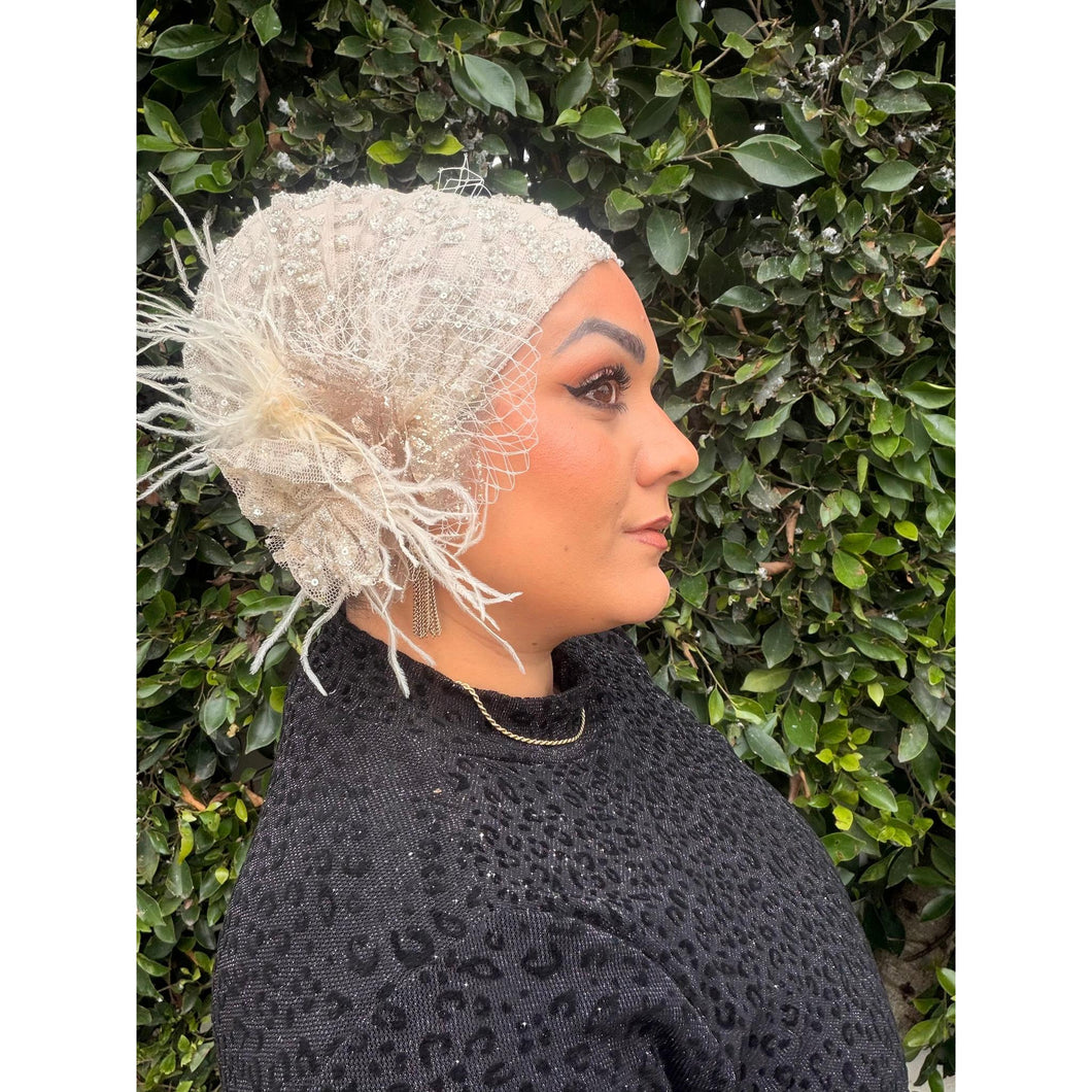 True to Yodfat's motto, this slip-on piece is a work of art that can be worn in different ways. Wear it with the detail on top, to the side, down by your ear, or in the back, there is no going wrong. The feather pieces add to the finished look. If you have been looking for ready-to-wear pieces that look great every time, I highly recommend getting this one. Long gone are the days where you fuss with pins and worry about your headcover coming undone.