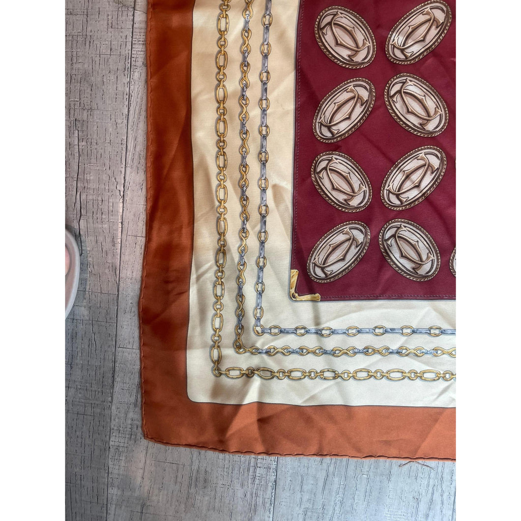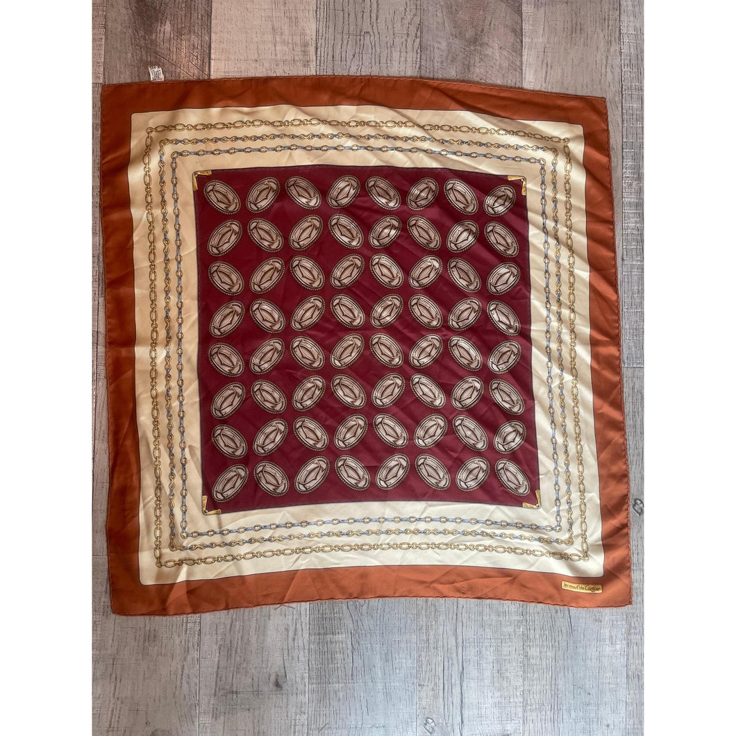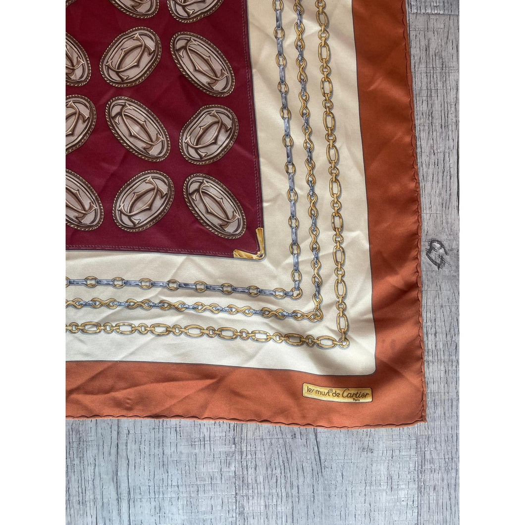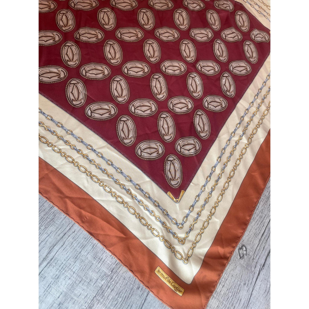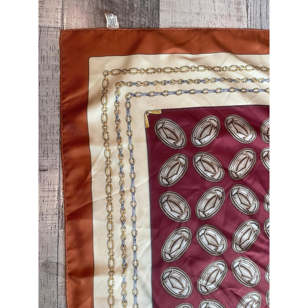 This Cartier silk burgundy with rust border print scarf is perfect for those who love the simplicity and luxury of classic colors. The versatile print complements almost any outfit, while the design offers endless styling possibilities. We dry cleaned this scarf prior to taking photos of it.
