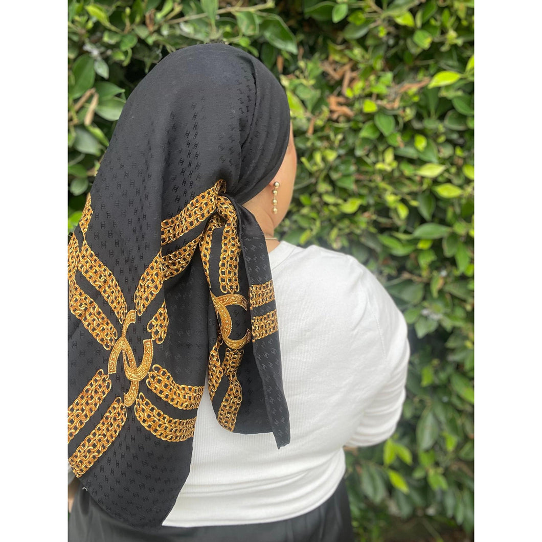 Chanel Authentic Vintage Designer Headscarf, Black & Gold Chain Link-Designer headscarf-The Little Tichel Lady