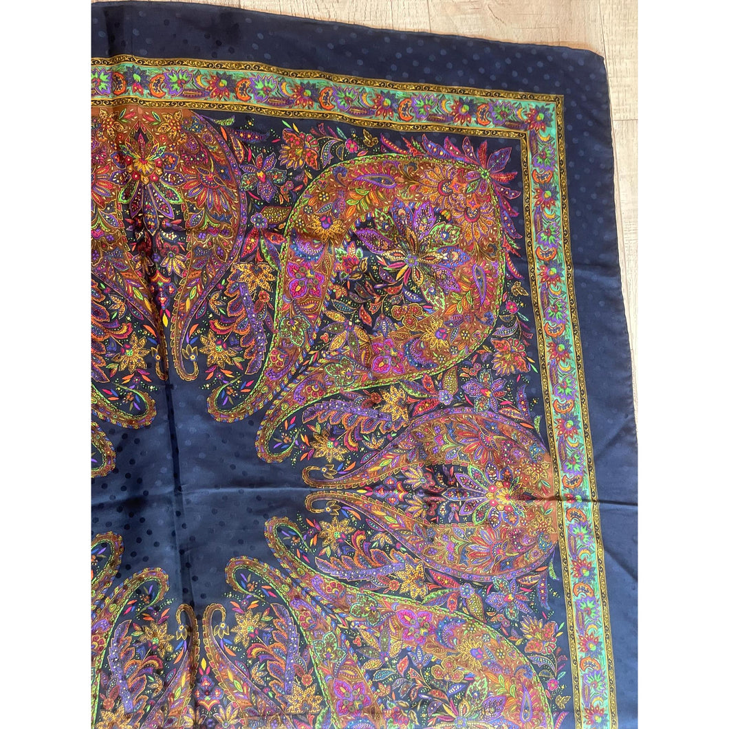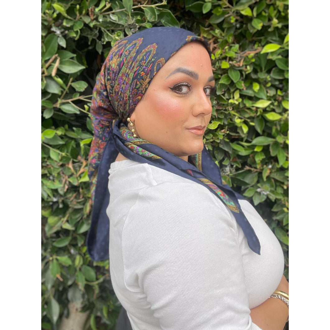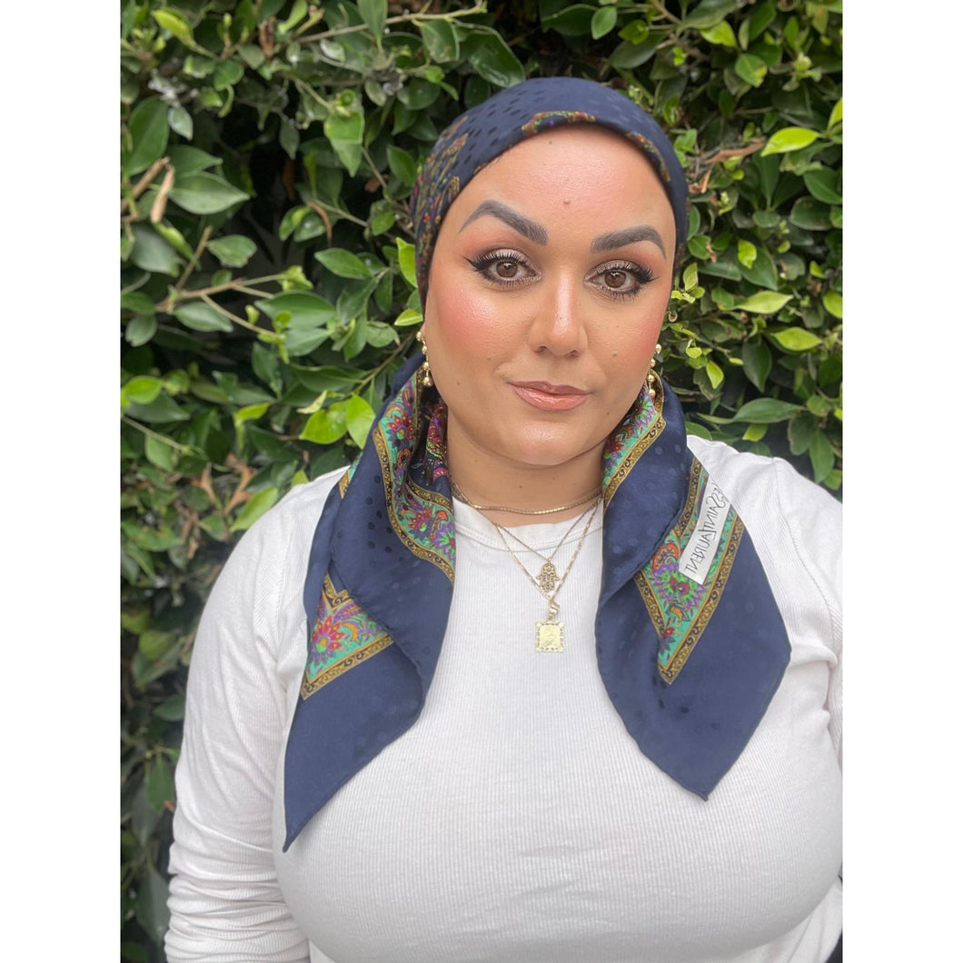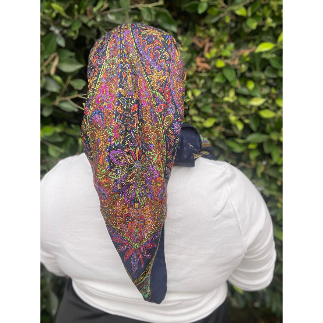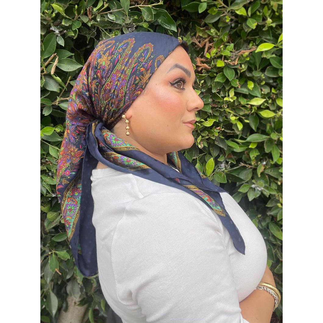 YSL Authentic Vintage Designer Headscarf, Navy Paisley