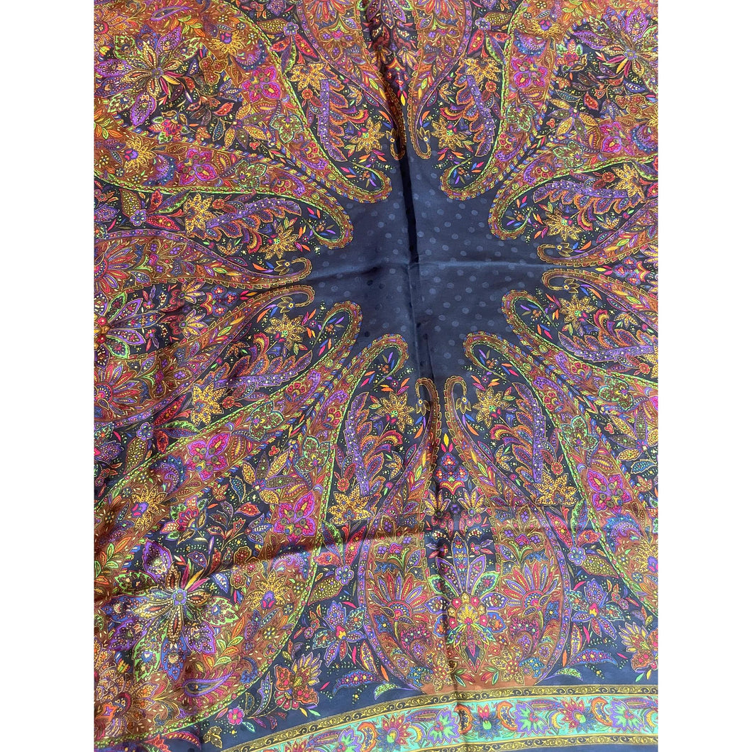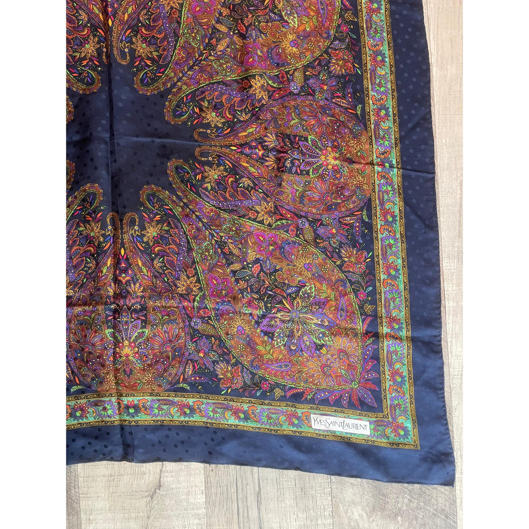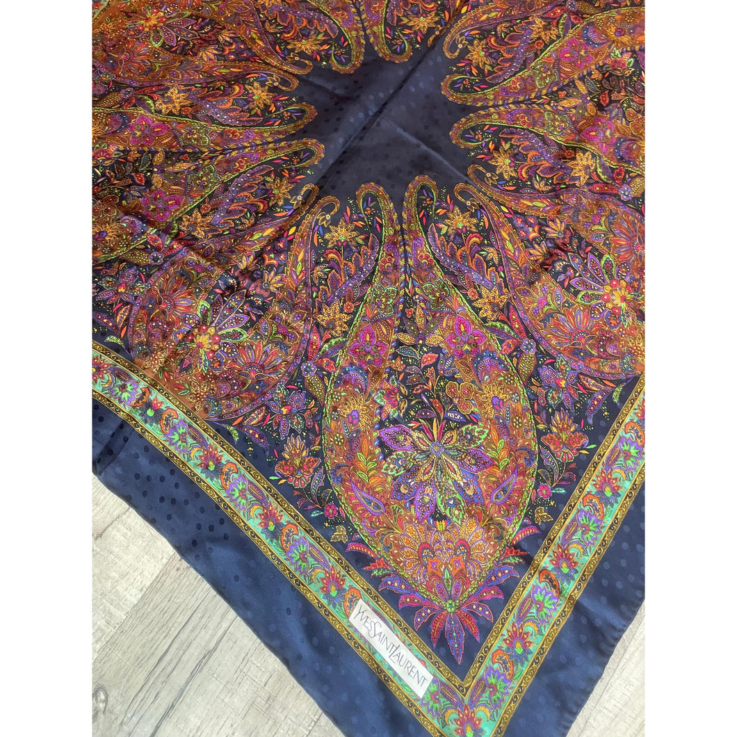 This exquisite Yves Saint Laurent silk scarf showcases a rich navy background adorned with a vibrant multicolored paisley design. The solid center creates a graceful balance, allowing the intricate print to cascade beautifully when styled as a headscarf. Subtle satin-like dot detailing is woven throughout the fabric, adding depth and a touch of understated luxury.