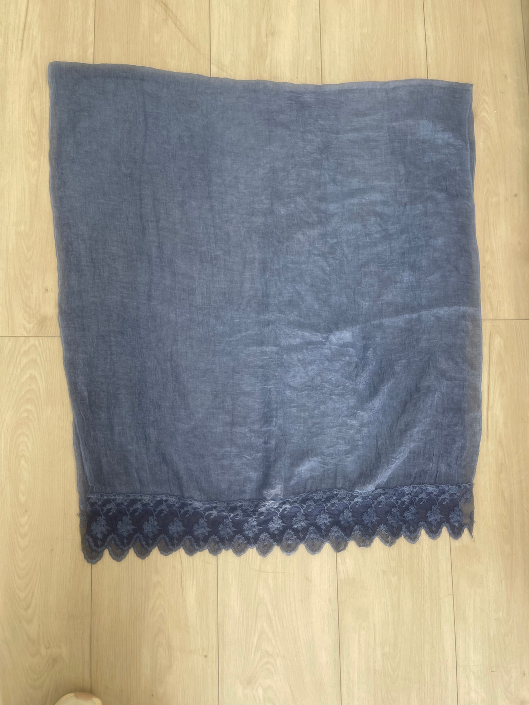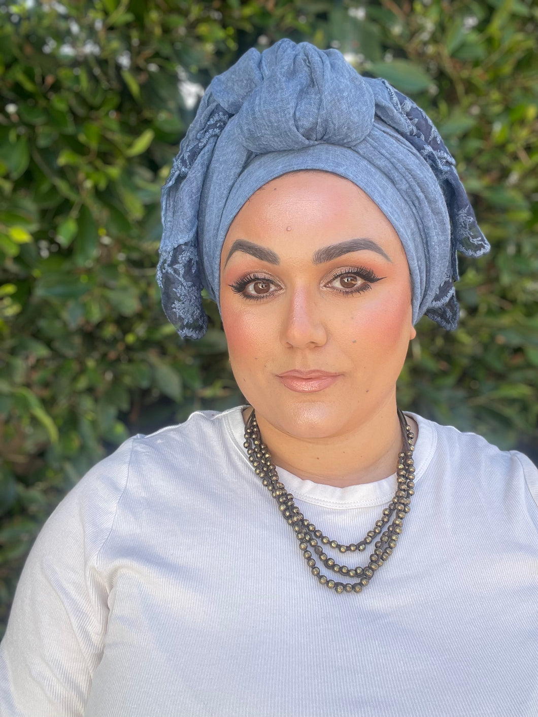 Meet our newest addition, the Israeli Arabesque wrap. This long, rectangular headwrap features an airy woven fabric with a naturally crinkled finish that adds effortless charm to any wrap style. Delicately embroidered scalloped lace adorns both ends, creating a stunning drape effect when tied or left to cascade down. The wrap’s generous width allows you to achieve beautiful volume even without a shaper, while adding a shaper or bobi underneath can create extra height and drama. Each color features a softly faded effect, with subtle shifts in tone that give the fabric depth and an elegant, lived-in beauty. Lightweight, breathable, and easy to style, The Arabesque Wrap is perfect for effortless everyday elegance or an elevated evening look.