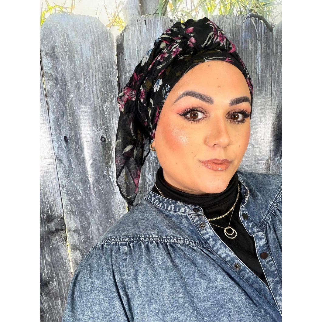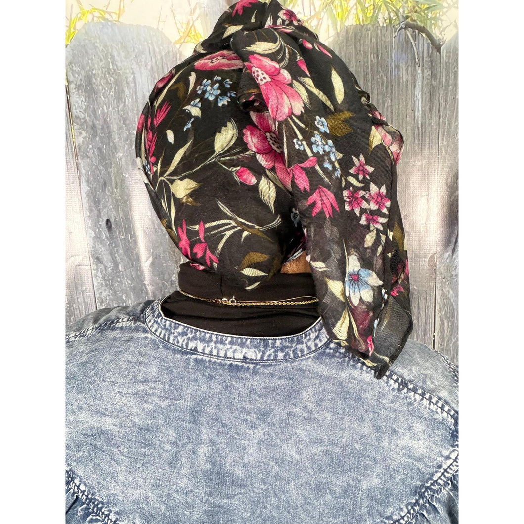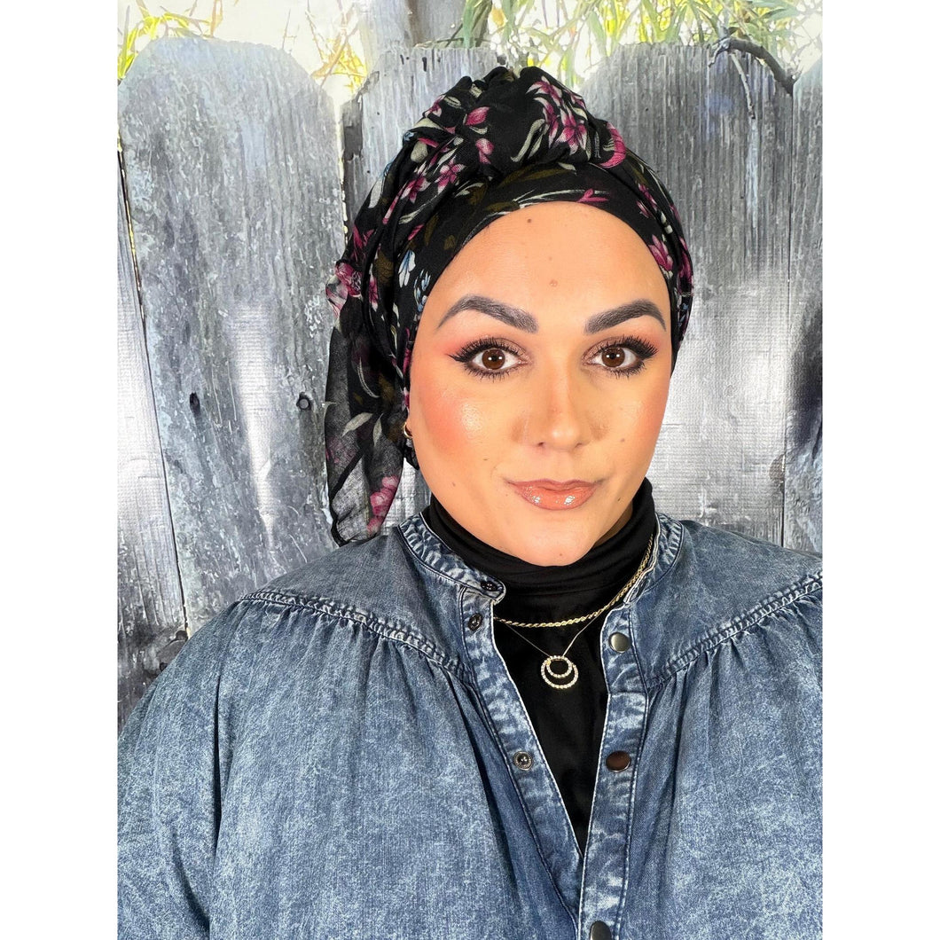 The floral print adds a soft, feminine touch while remaining versatile enough to pair easily with a wide range of outfits. Each wrap works beautifully on its own, or layered with essentials underneath. Many women find it stays comfortably in place with little to no grip, especially when styled as a turban, but it also pairs seamlessly with velvet headbands or other underpieces if desired.