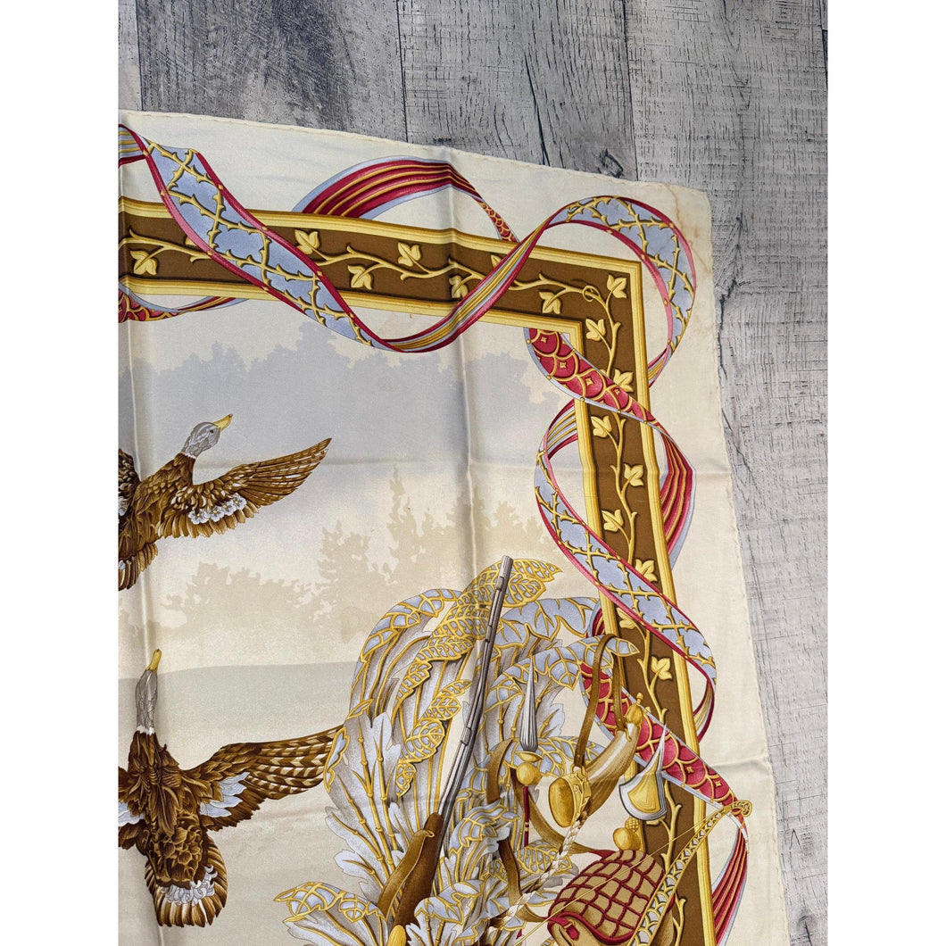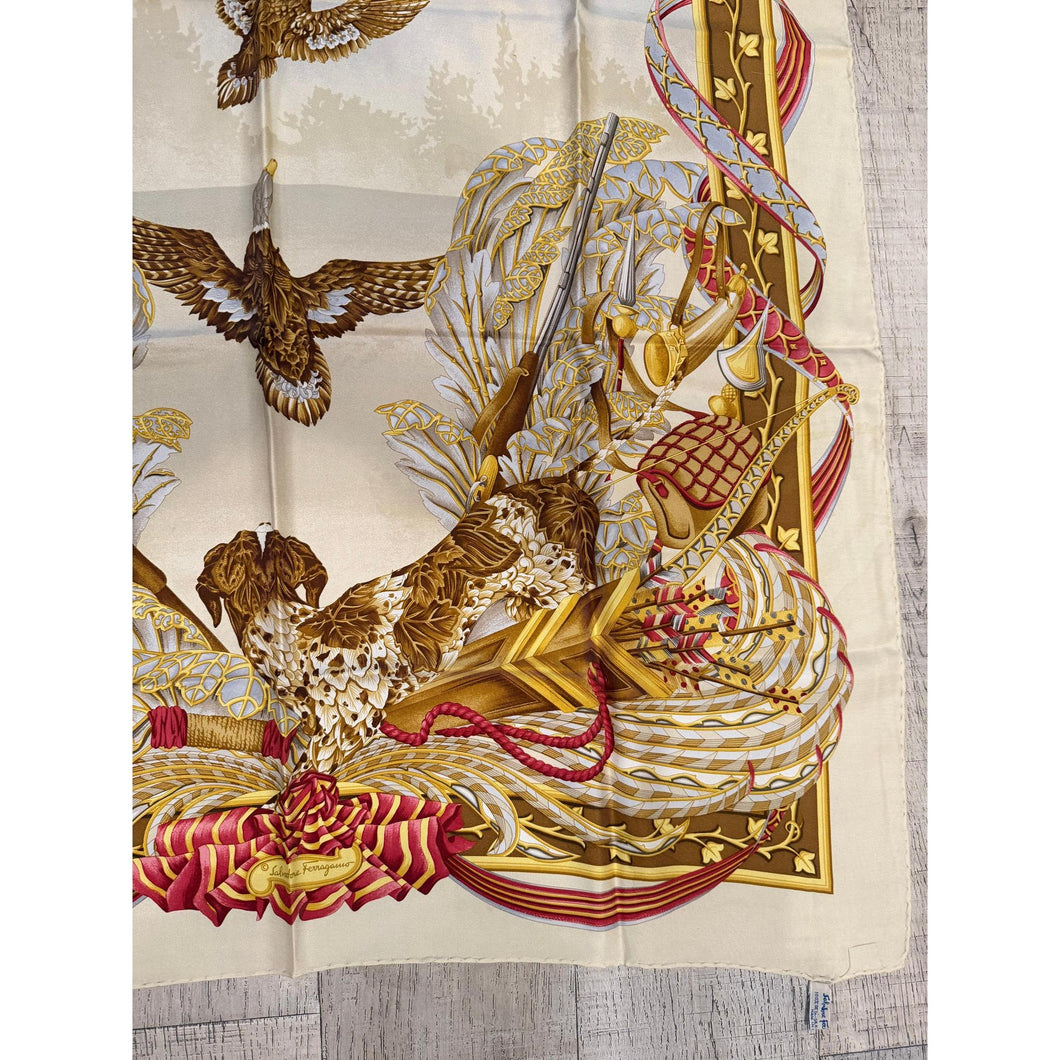 This Salvatore Ferragamo silk scarf features a detailed scene with various beautiful birds. The neutral background makes it perfect to wear with different outfits. This piece was dry cleaned prior to taking photos of it.
