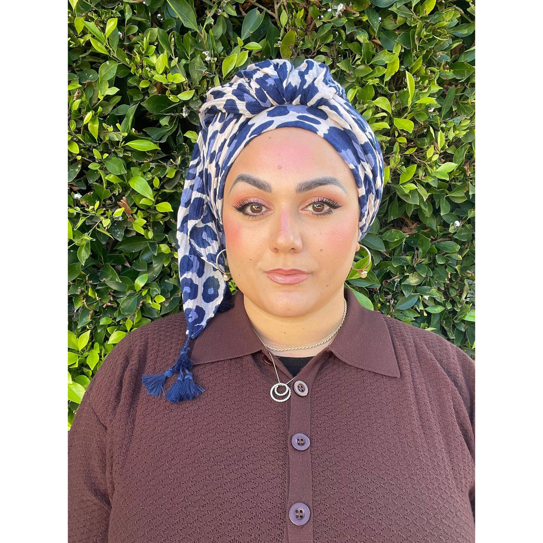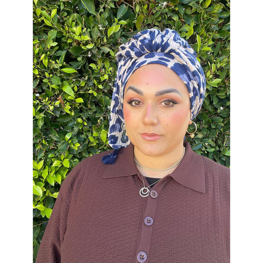 Cozy Israeli Print Headwrap + Tassel Details - Blue Leopard