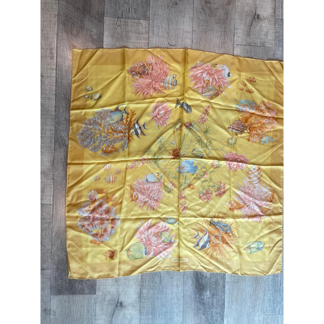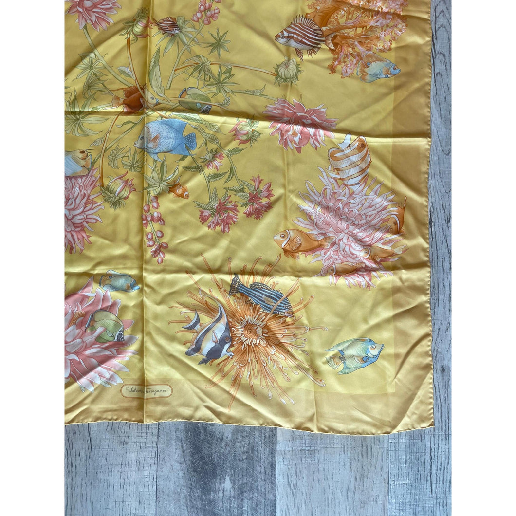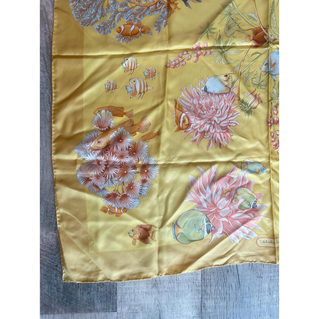 Dive into elegance with this Salvatore Ferragamo silk scarf, showcasing a vibrant underwater-inspired print. Bursting with colorful fish, coral, and seashells set against a sunny golden background, this scarf captures the playful beauty of the ocean in luxurious detail. Crafted from premium silk in Italy, it reflects Ferragamo’s signature artistry and commitment to high-quality materials. Perfect for elevating any outfit, this scarf is a timeless accessory for those who appreciate refined sophistication with a splash of whimsy.